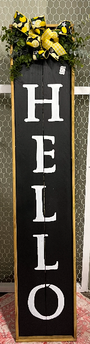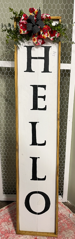 A vertical weather treated Hello board. Let us know if you want black or white background and if you want cursive or block. Also, if you have any special colors let us know.